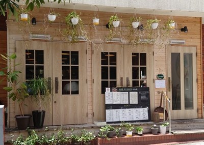 正面の壁一面が木の板が何枚も折り重なった感じで、インパクトがあります。