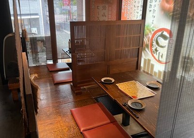 木の質感がナチュラルなカウンター席や掘りごたつ式のテーブル席が並んでいて、ほっこりできる空間になっています。