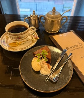 甘さ控えめのチョコレートケーキは、バニラアイスと濃厚クリームが添えられていて、コーヒーにもぴったりです。