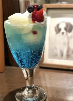 真っ青なブルーのソーダに、たっぷりのアイスクリーム・ホイップ・ベリー類・マシュマロ・ミントの葉が添えてあり、見た目はパフェのよう。