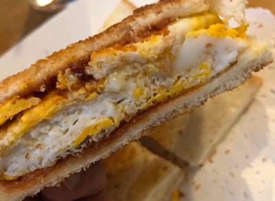 人気の「エッグトーストサンド」は、ケチャップが塗られたパンに焼きたての玉子焼きがサンドされたサクサク食感。