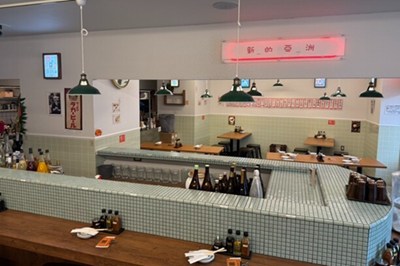 高架下にある明かりが目立つ外観で、白を基調とした店内は明るく清潔感があります。
