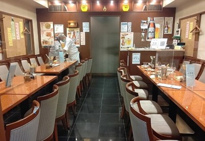 真っ赤なのれんが印象的な外観で、シンプルな店内にはカウンター席が並び、壁にはメニューがたくさん貼られています。