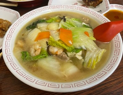 人気の「焼麺(やきそば)」は、表面を香ばしく焼いた中華麺に野菜がたっぷり入った特製の餡をかけたもの。