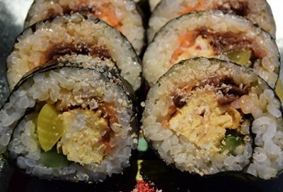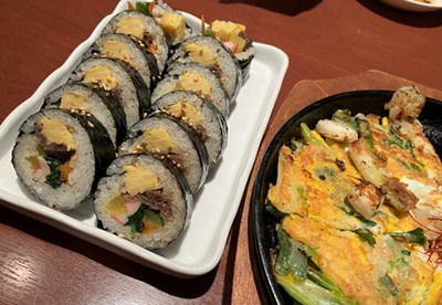 人気の「キンパ」は、味付けされた牛肉・玉子焼き・たくあん・かんぴょうなどが入った、優しい味付けの韓国風海苔巻。