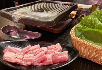 「サムギョプサル」は、テーブルで厚切りの豚の三枚肉を豪快に焼いていただきます。