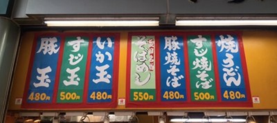 屋台風の外観で大きくメニューが書かれた黄色い看板が目印です。