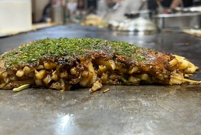 具材の旨味に加えて、クレープのような軽い食感の生地やしっとりモチモチの中華麺を感じられる豪華なお好み焼きです。
