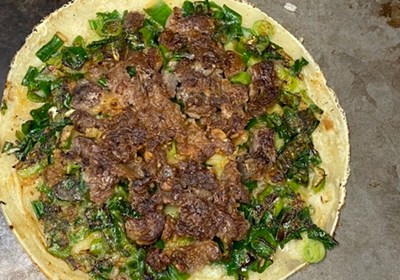 「ぼっかけ好み焼き」は、生地の上に具材をのせて焼くのせ焼きスタイルで、歯ごたえのある牛すじやこんにゃくがたっぷり乗ったお好み焼き。