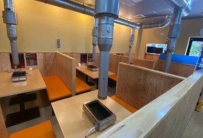 テーブル席と半個室の座敷席があり、各テーブルに配置される赤いダクトが印象的。