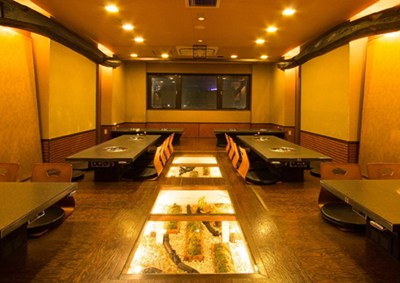 オレンジのライトに照らされる店内は、床下にお庭風の演出があるなどおしゃれな空間です。