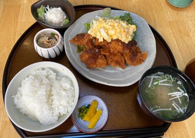 山盛りのチキンカツと上に乗ったタルタルソースが絶妙で、その他にご飯・味噌汁・小鉢などが付いて味もコスパも最高です。