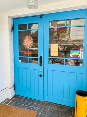 一面ガラス張りのお洒落な見かけで、鮮やかな青の屋根が目印。