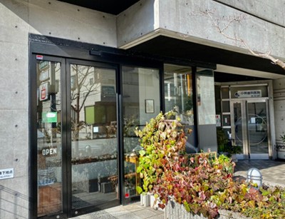 コンクリートの外壁に黒縁のガラス戸などスタイリッシュな印象です。