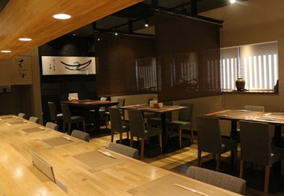 大きなガラスに長い暖簾が目印で、木の香りが漂うシンプルな店内は、木のカウンター・テーブル・オレンジ色の間接照明が粋な空間を演出しています。