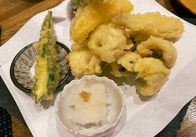 お造りの盛り合わせ・季節のフルーツや野菜を使ったサラダ・旬魚の天ぷら・穴子の棒寿司などが人気。