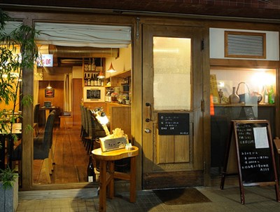 白塗の壁に店名が縦書きで書かれていて、木のドアがとってもシンプルでスタイリッシュな店構え。