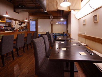 大きなガラスに長い暖簾が目印で、木の香りが漂うシンプルな店内は、木のカウンター・テーブル・オレンジ色の間接照明が粋な空間を演出しています。