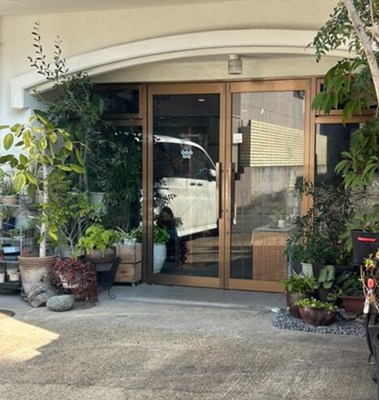 お茶碗の絵がトレードマークの看板が目印で、入り口にはグリーンがいっぱい飾られています。