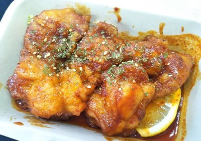 揚げたてジューシーなヤンニョンチキンは、甘辛ダレがたっぷりかかっています。
